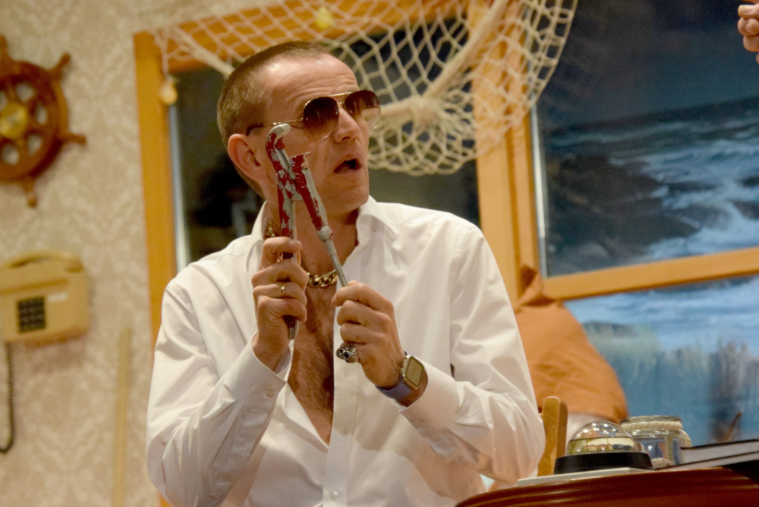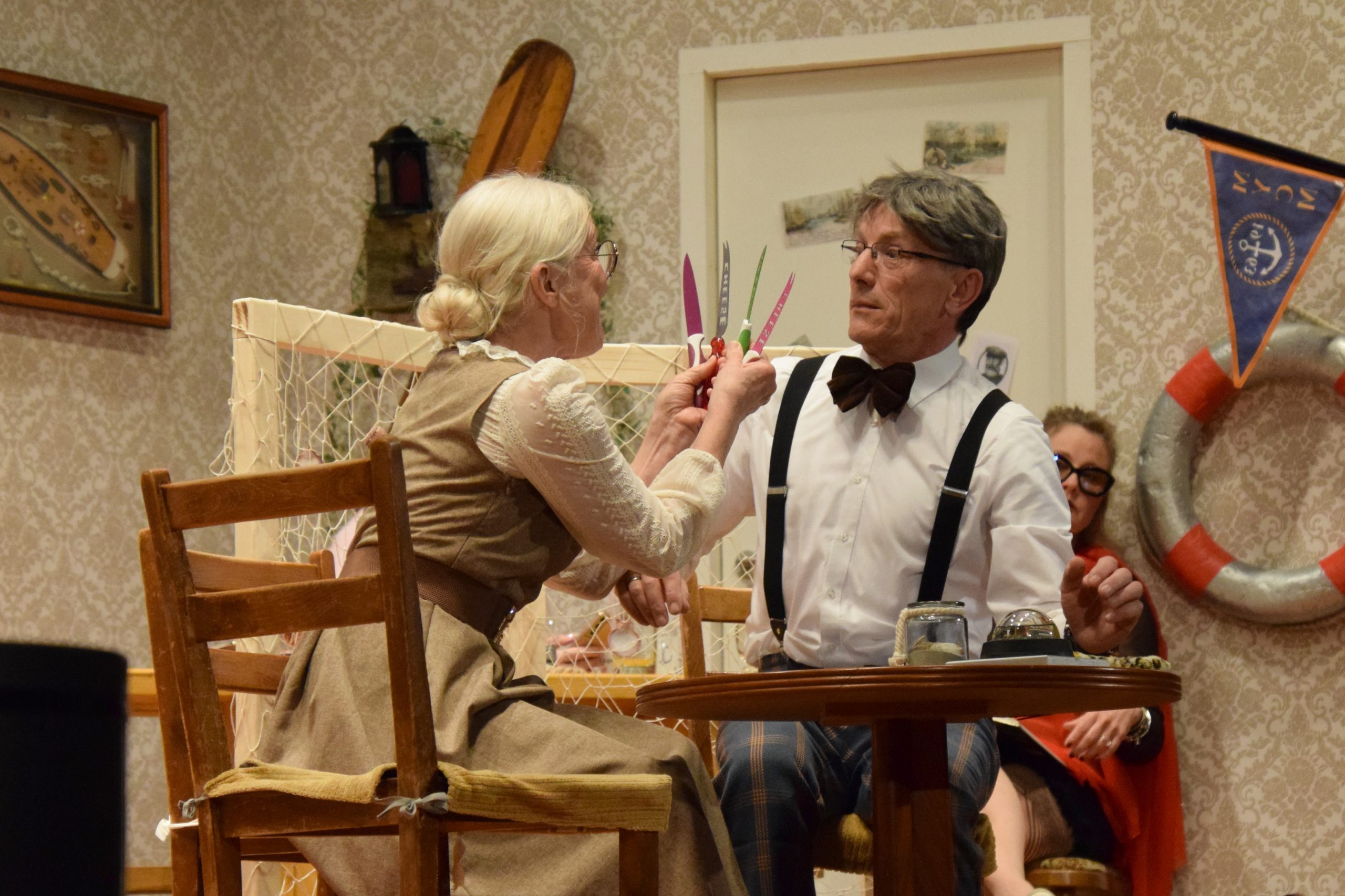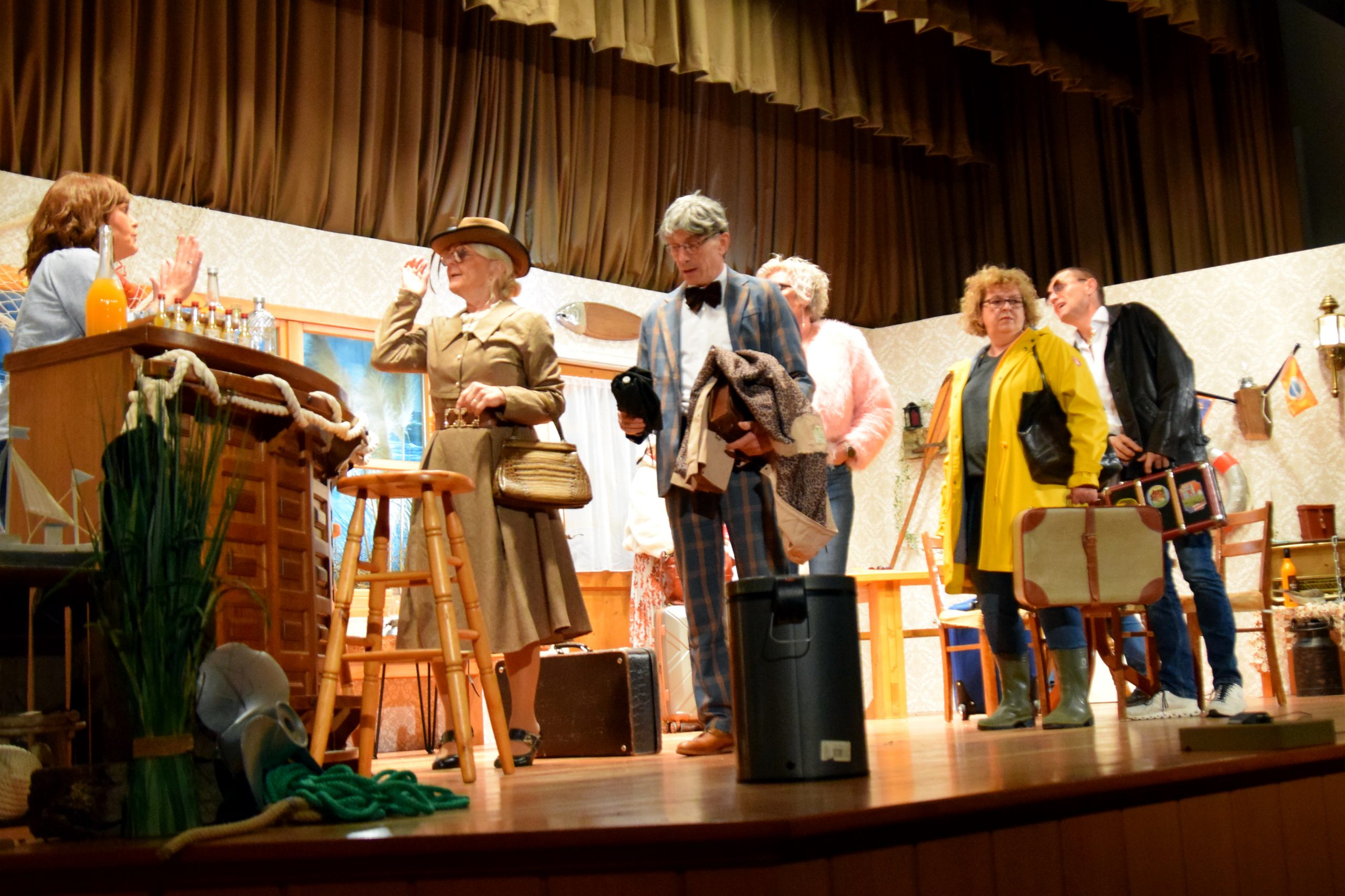 Trauen Sie niemanden – auch nicht ihrem Sitznachbarn. So instruierte Regisseurin Sabine Schäfers-Bechtloff zwinkernd das Publikum, bevor sich der Vorhang öffnete. In der mit Liebe zum Detail gestalteten Kulisse eines in die Jahre gekommenen Hotelfoyers entlarvte Portier Hein Bühl, gespielt von Stefan Schäfers, seinen Chef und Hotelbesitzer Bertus Ackermann als Pleitegeier. Patrick Delitzscher hatte sich eigens für die Rolle des Hoteliers einen original friesischen Dialekt angeeignet. Das gesamte Vermögen verzockt, die Buchführung frisiert und nebenbei noch Zeit für Seitensprünge – das alles holte Bertus plötzlich ein und er beichtete Hein sein ganzes Dilemma. Er fürchtete um sein Leben.