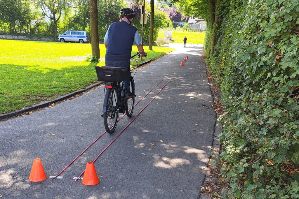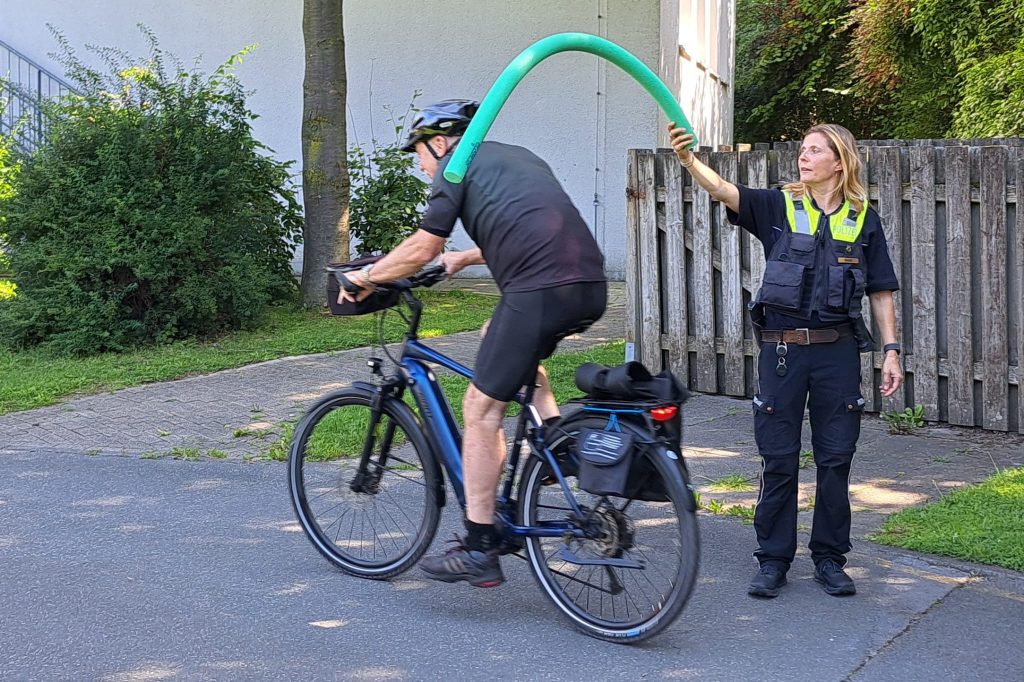 Im Parcours ging es ums Geradeausfahren, Slalomfahren sowie Handzeichen und Rückschaupflicht beim Abbiegen oder Vorbeifahren an Hindernissen. Hindernisse, wie sie auf vielen Radwegen plötzlich auftauchen können, simulierte Martina Betzel mit Hilfe einer Poolnudel, unter der die Radlerinnen und Radler geduckt durchfahren mussten. Enges Kreisfahren und eine Zielbremsung zählten ebenfalls zum Fahrtraining.