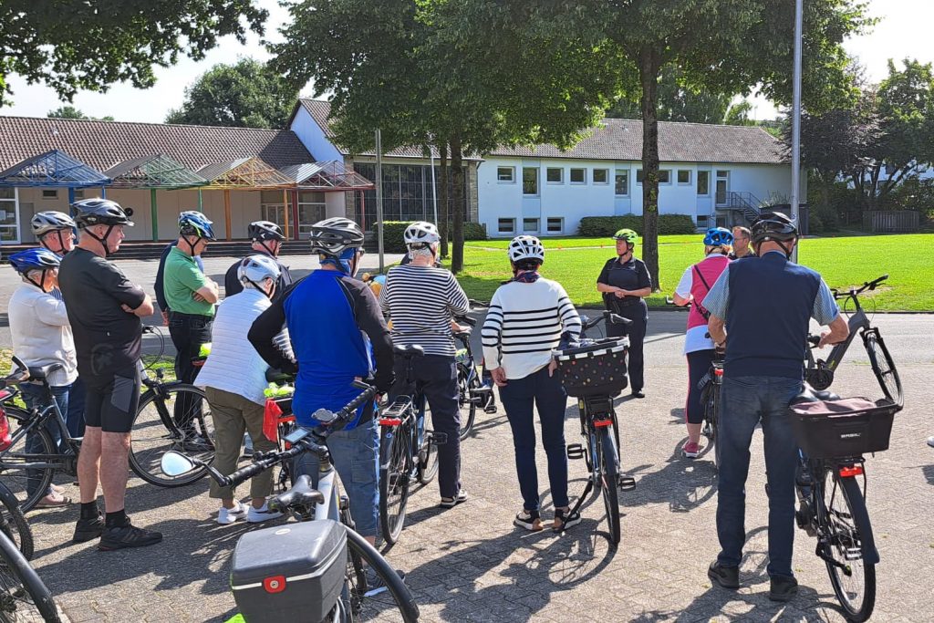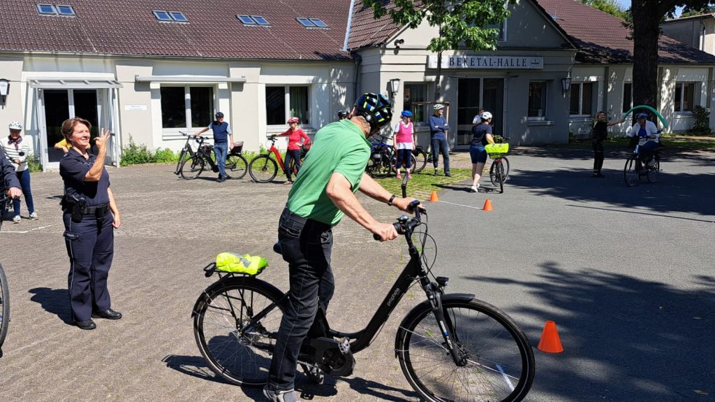 Neue Verkehrsschilder, neue Verkehrsregeln für Radfahrer und viele wertvolle Tipps zum sicheren Radeln mit dem Pedelec – beim Fahrradsicherheitstraining in Neuenbeken konnte einiges gelernt werden. Der SCV Neuenbeken hatte das kostenlose Training für Senioren letzte Woche in Kooperation mit der Arbeitsgemeinschaft und dem Heimatschutzverein Neuenbeken angeboten. Zwei Polizistinnen und ein Polizist von der Verkehrssicherheitsberatung der Paderborner Polizei führten den intensiven Kurs auf dem Neuenbekener Schulhof durch. 16 Neuenbeker Seniorinnen und Senioren im Alter von 62 bis 86 Jahren nahmen teil. Das ist genau die Zielgruppe bei solchen Programmen sagt die Polizei, da ältere Radfahrende oft mit Elektrorädern verunglücken. Im Kreis Paderborn zogen sich letztes Jahr 174 E-Biker teils schwere Verletzungen zu.