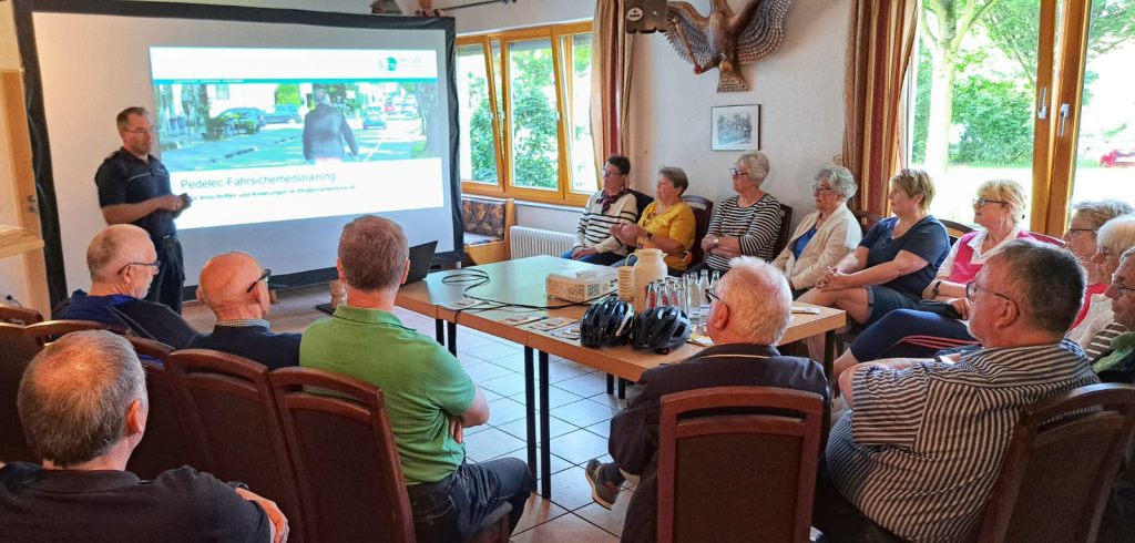 Nach der Begrüßung durch die SCV-Vorsitzende Sonja Bucholz nahm Polizeihauptkommissar Paul Soloducha die Kursteilnehmer mit auf eine Reise durch das aktuelle Verkehrsrecht. Die Fahrschule lag für alle Teilnehmenden schon Jahrzehnte zurück. Viele Neuerungen im Verkehrsrecht – speziell in Bezug aufs Radfahren – erläuterte der Beamte mit Unterstützung von Fotos auf der Präsentationsleinwand. Soloducha erklärte, dass für Elektrofahrräder mit Tretunterstützung bis 250 Watt und maximal 25 km/h, den sogenannten Pedelecs, die gleichen Regeln gelten wie für normale Fahrräder. Er zeigte auf, welche Radwege benutzt werden müssen und unter welchen Voraussetzungen auf der Straße gefahren werden muss. Das weiße Schild mit dem Fahrradsymbol und dem Wort „frei“ bedeutet, dass dort nur „als Gast“ geradelt werden darf. So muss zum Beispiel auf frei gegebenen Fußwegen besonders Rücksicht auf Fußgänger genommen werden. Mehr Sicherheit für Radfahrer auf der Straße bieten die Fahrradschutzstreifen und auch die Vorschriften zum seitlichen Abstand zwischen Radlern und Autos. Innerorts müssen Autofahrer beim Überholen 1,5 Meter Abstand zu Radlern halten, außerorts sogar zwei Meter. Der Verkehrssicherheitsberater machte deutlich, dass die Polizei auch bei Radfahrern auf das Handynutzungsverbot achtet. Wer erwischt wird zahlt 55 Euro.